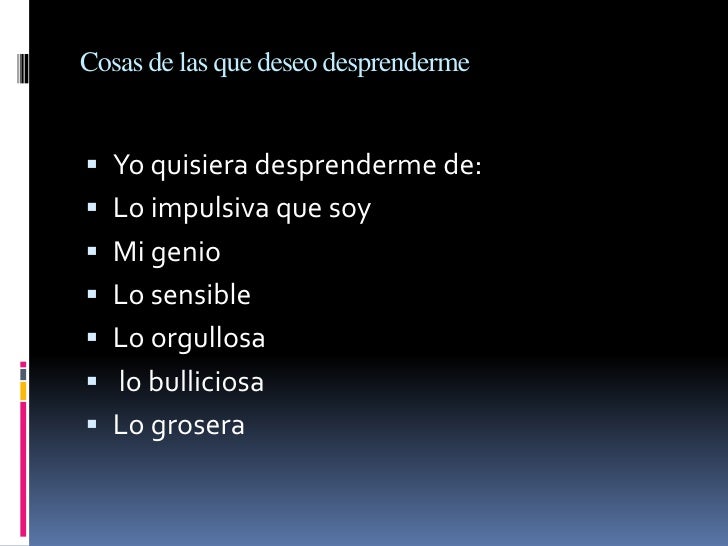 - 11. Cosas de las que deseo desprenderme Yo quisiera desprenderme de: Lo impulsiva que soy Mi genio Lo sensible Lo orgullosa lo bulliciosa Lo grosera cosas qu no quisiera seguir teniendo o quitar de mi vida o de mi personalidad