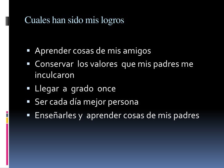 - 12. Cuales han sido mis logros Aprender cosas de mis amigos Conservar los valores que mis padres me inculcaron Llegar a grado once Ser cada día mejor persona Enseñarles y aprender cosas de mis padres