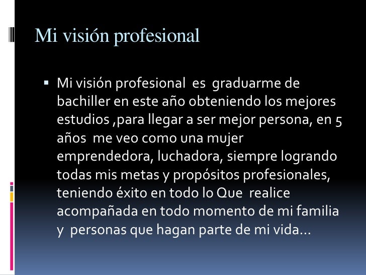 - 5. Mi visión profesional Mi visión profesional es graduarme de bachiller en este año obteniendo los mejores estudios ,para llegar a ser mejor persona, en 5 años me veo como una mujer emprendedora, luchadora, siempre logrando todas mis metas y propósitos profesionales, teniendo éxito en todo lo Que realice acompañada en todo momento de mi familia y personas que hagan parte de mi vida