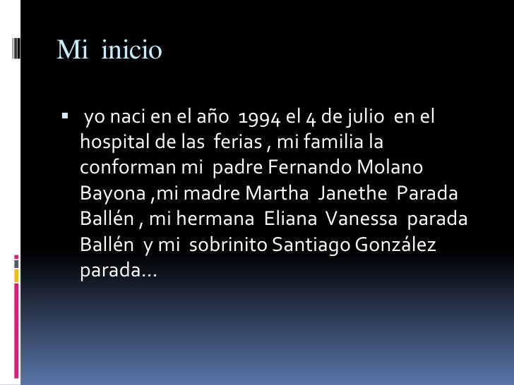 - 6. Mi inicio yo naci en el año 1994 el 4 de julio en el hospital de las ferias , mi familia la conforman mi padre Fernando Molano Bayona ,mi madre Martha Janethe Parada Ballén , mi hermana Eliana Vanessa parada Ballén y mi sobrinito Santiago González parada