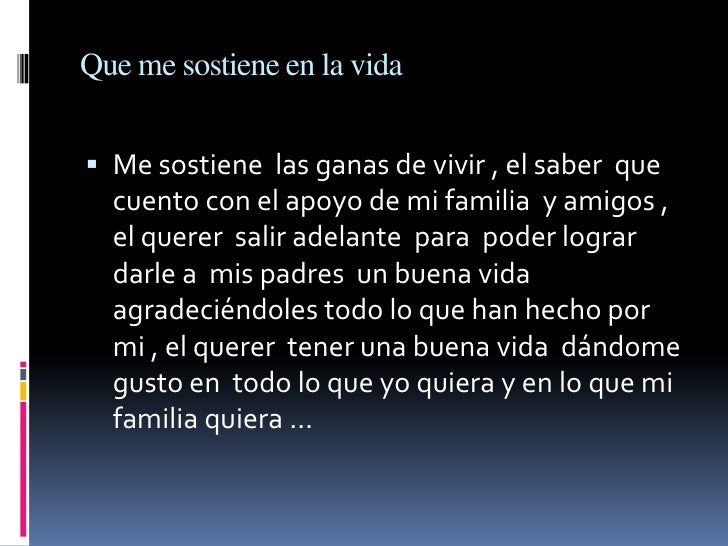 - 7. Que me sostiene en la vida Me sostiene las ganas de vivir , el saber que cuento con el apoyo de mi familia y amigos , el querer salir adelante para poder lograr darle a mis padres un buena vida agradeciéndoles todo lo que han hecho por mi , el querer tener una buena vida dándome gusto en todo lo que yo quiera y en lo que mi familia quiera