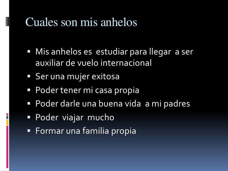 - 8. Cuales son mis anhelos Mis anhelos es estudiar para llegar a ser auxiliar de vuelo internacional Ser una mujer exitosa Poder tener mi casa propia Poder darle una buena vida a mi padres Poder viajar mucho Formar una familia propia