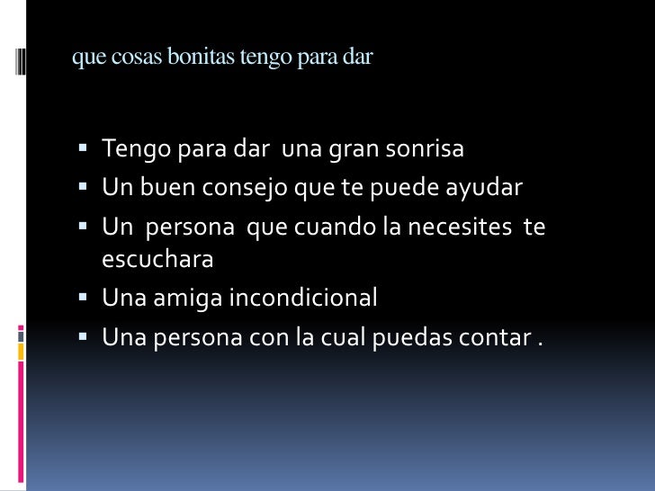 - 9. que cosas bonitas tengo para dar Tengo para dar una gran sonrisa Un buen consejo que te puede ayudar Un persona que cuando la necesites te escuchara Una amiga incondicional Una persona con la cual puedas contar .
